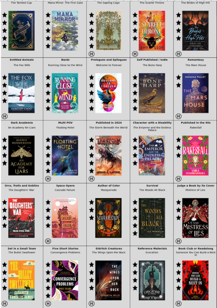 - Multi POV, Reference Materials, and Bards were excellent, because they fit with my taste in books and were fun to find options for. Bards in particular, I found was a square filled with fun options for me to pick from, and fit nicely with my preferences for stories featuring layered narratives.