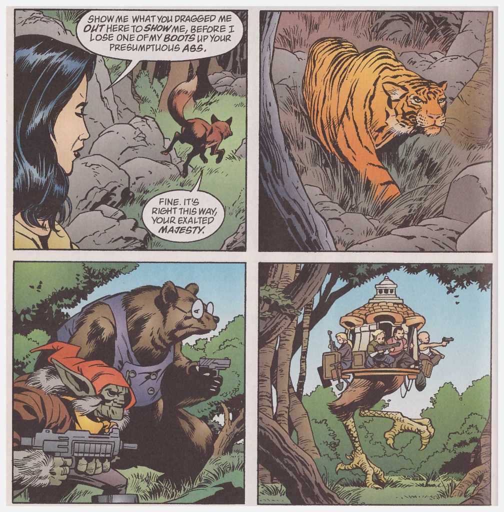 Meanwhile, there were two thematically disonant moments in Animal Farm that stuck with me in a bad way. The first, Snow White wouldn’t acknowledge the effective improsnment of all non-human fables – understandable given the difficulties keeping them secret – but she didn’t really show any sympathy for their plight and mostly tells them to suck it up and appreciate how good things are for them. The second, that they were frustrated that the appointed mayor of the non-human settlement was a human, depriving them of representation. Yes there was a brutal rebellion happening, but Snow White brushed off both concerns, and didn’t make any moves to remedy or allievate them in the handling of the situation after the conflict had been resolved. While this perhaps hints at Snow White’s own problems as an administrator, the narrative didn’t seem interested in acknowledging this, and the brutal rebellion came off as violent extremists (and they were) without any legitimate grievances (it seemed like there were) that helped set them on this path. Now, maybe both Snow and Wolf will eventually get treated the same way the narative treats characters like Jack and Bluebeard, who slot more easily in the villain role. That isn’t the case from the first several volumes, however.