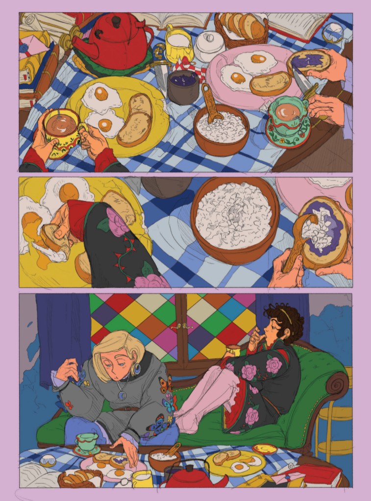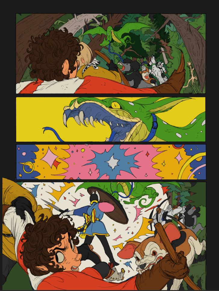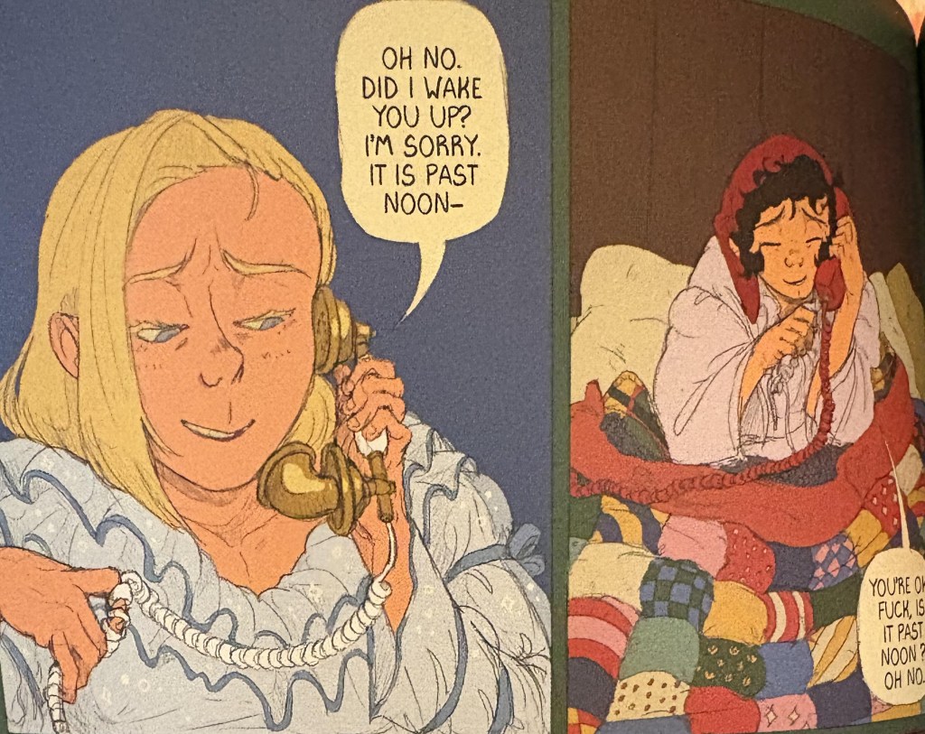This book spends a good amount of time on mental health (content warning for suicidal ideation in particular), and I liked how Jules doesn’t ever find a magic fix for any of his problems. Even when he’s on joyful adventures picking pockets and stabbing rich folks, he’s constantly worrying about whether he is enough to be worth sticking around. It’s a little unclear how much of this was a literal Devil hanging around his neck, but it gave a more serious subplot to balance out the chaotic energy of the art and main storyline.