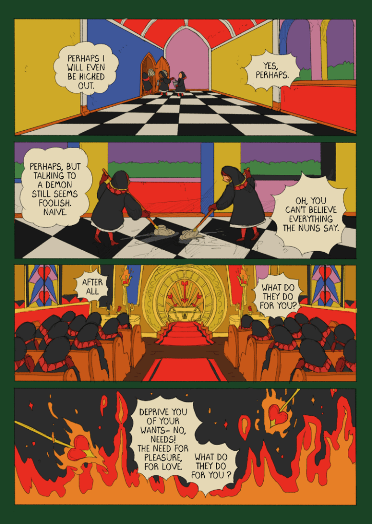 I came for trans nuns making deals with the Devil, but I stayed for the art. H.A. used almost (perhaps no) shading, instead relying on blocks of color that were densely packed starbursts of energy. It gave the story an Alice in Wonderland feel, and complimented the whimsical storyline quite nicely. H.A. also made great use of interesting layouts, especially during montages or when The Devil started acting up. Honestly, the whole opening sequence where Jules approaches the Devil to negotiate their freedom (or imprisonment depending on how you look at it) was entrancing. One of the strongest openings to a comic I’ve seen. The only real complaint I have in the art department is that the swordfights felt a little stilted and poorly choreographed, but that’s easy to forgive.