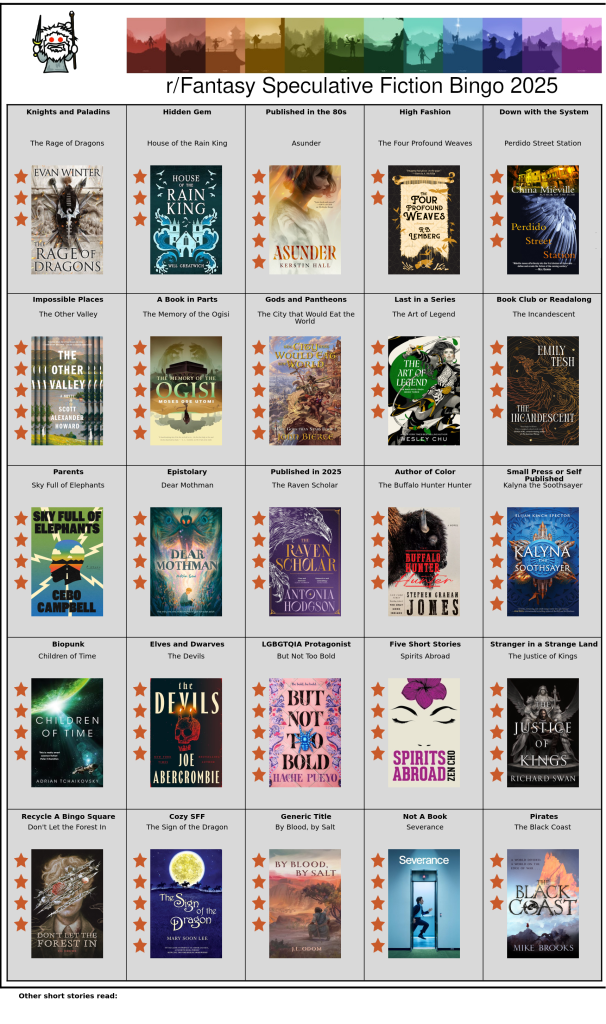It’s almost the end of March, which means the ending of the r/Fantasy Book Bingo Competition! I’ve already done write-ups for my two main cards (Achillean and Graphic Novels respectively). However, I realized that in all my other reading, I had enough to throw together a third card with no additional restrictions. It’s got some real gems, and I’m happy to say that there’s only one here that I left actively disliking. However, highlights include The Memory of the Ogisi, The City that Would Eat the World, The Sign of the Dragon, and But Not Too Bold.